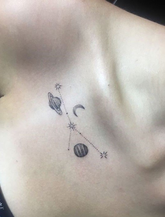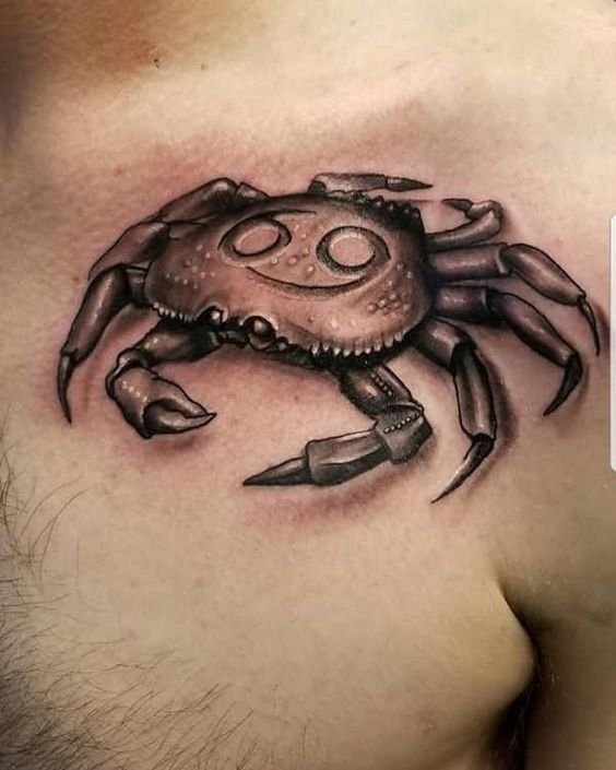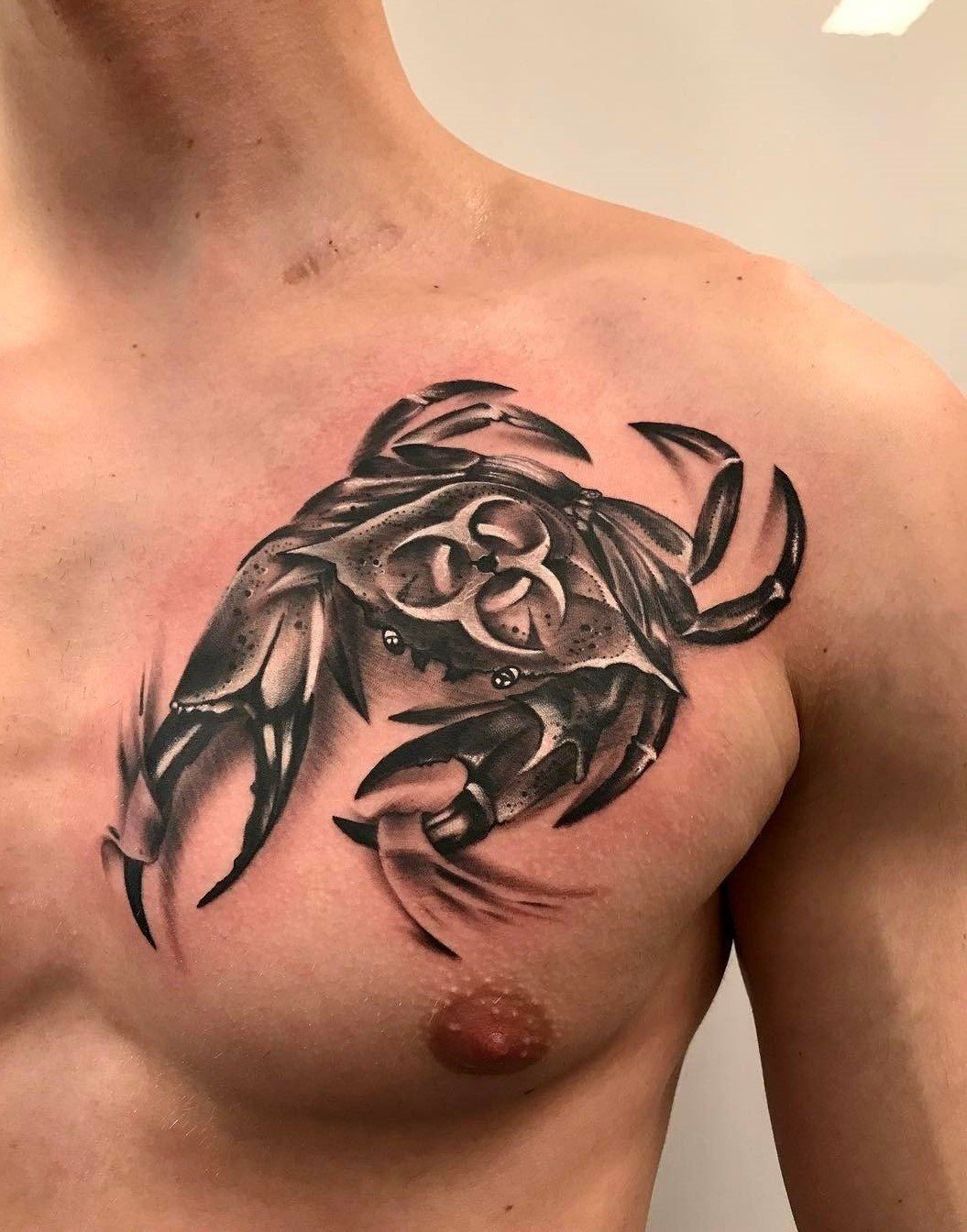 - Груди: Ця частина тіла - альтернативний варіант для тих, хто все ж таки віддає перевагу масштабним тату, які поєднують у собі різні елементи, кольори або стилі. Особливо тату знак зодіаку Рак на грудях популярне серед чоловіків, які прагнуть підкреслити свою силу, мужність і брутальність.