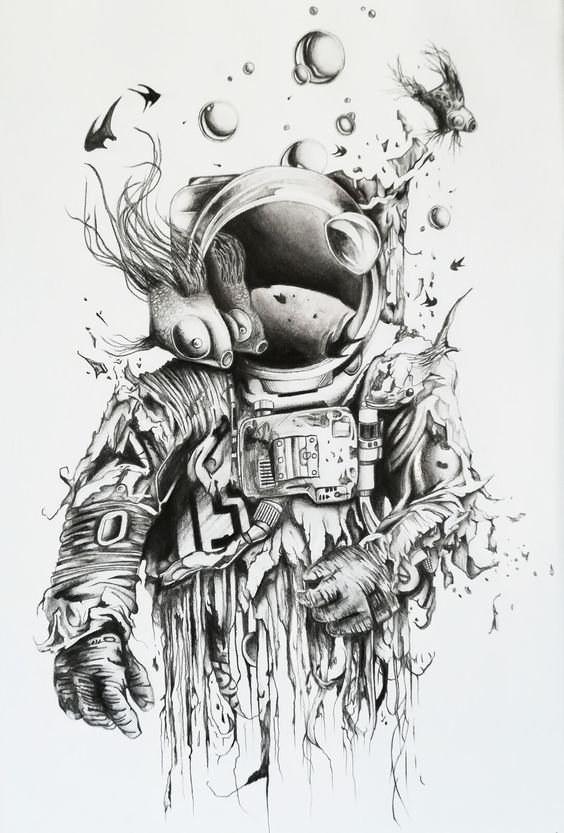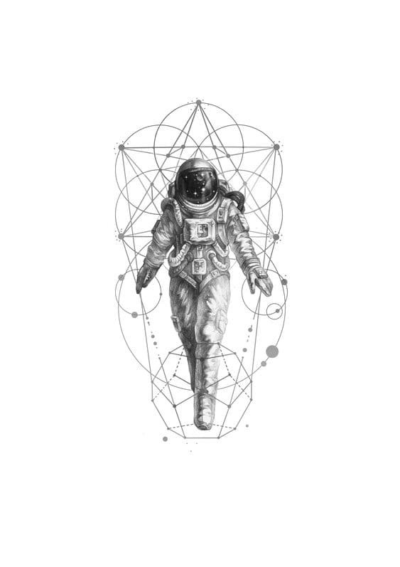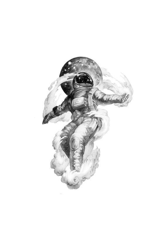 Ескіз астронавта являє собою фігуру людини або людиноподібної істоти у скафандрі. Поруч можуть бути розташовані планети, космічний корабель, супутники, інопланетяни й так далі. Така робота часто буде виконана в чорному кольорі з білими фрагментами. Рідко тут можуть бути використані інші кольори, наприклад, зелений, щоб підкреслити колір очей прибульця, чи помаранчевий, який підкреслить виліт палива з сопла ракети.