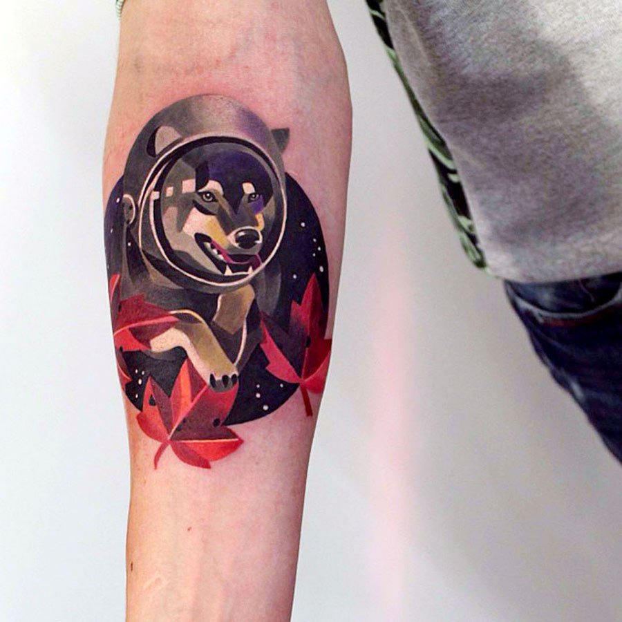 Татуювання космонавта у вигляді невеликої тварини в яскравих кольорах та стилі тату акварель - відмінний вибір для творчих дівчат.