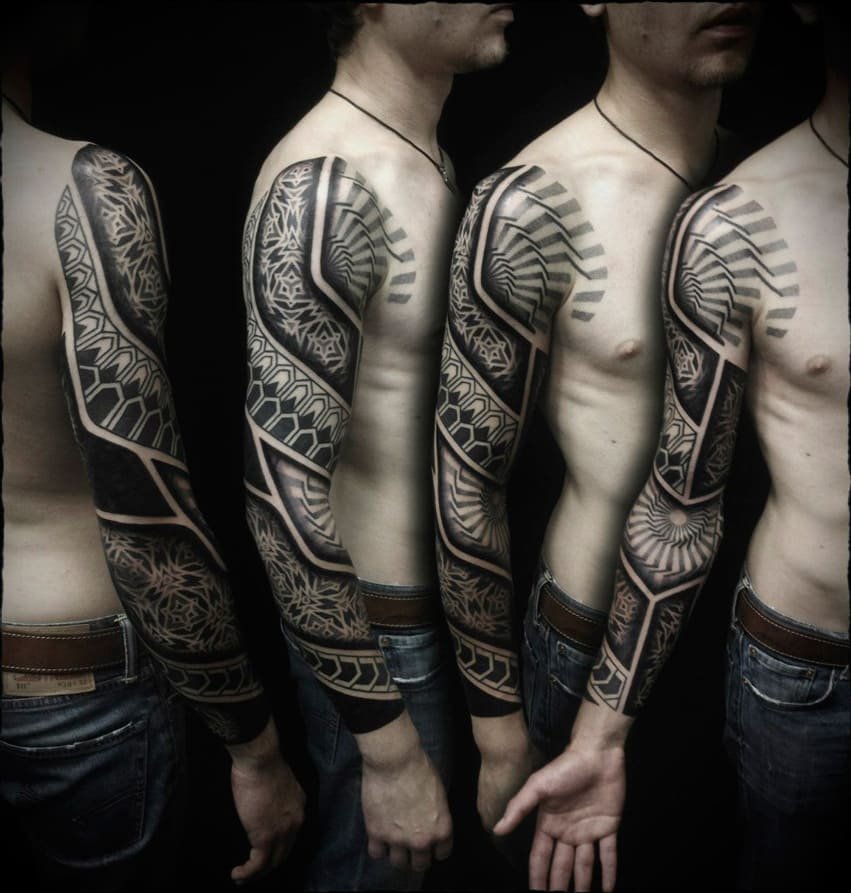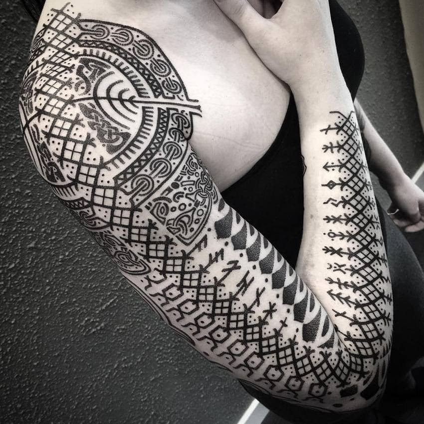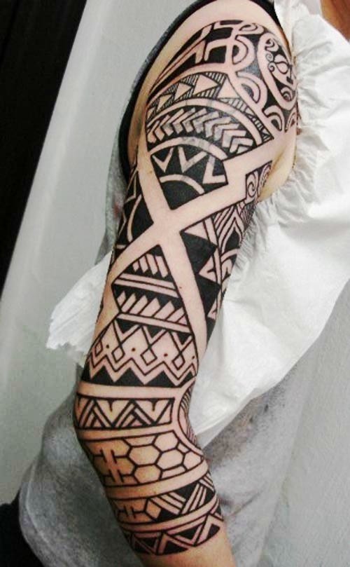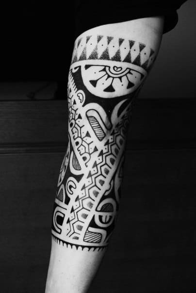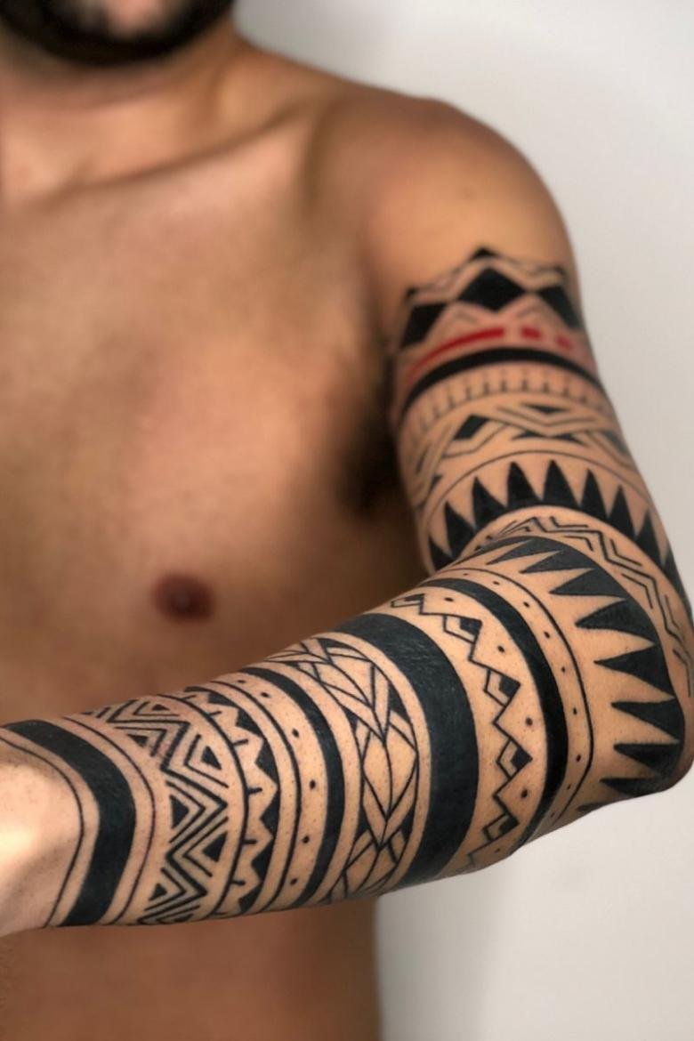 Часто етнічне татуювання розтягується на всю руку, або ногу. Зображуються дані татуювання в чорному кольорі, хоча за бажанням, колірний фон можна розбавити іншими відтінками.