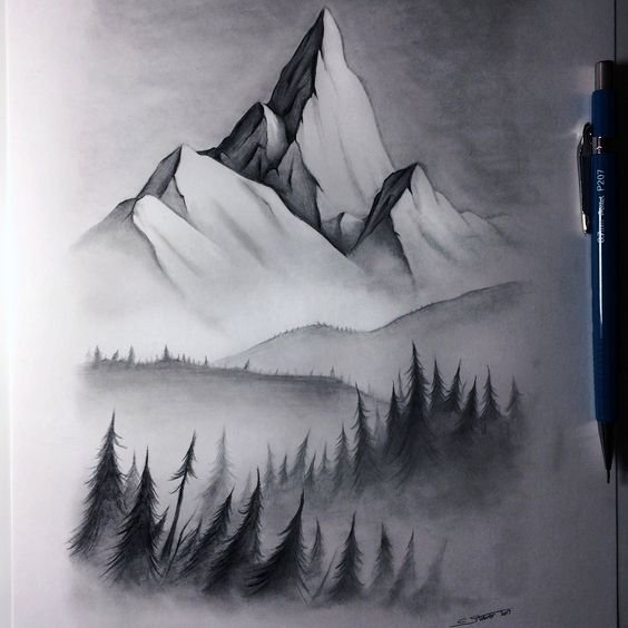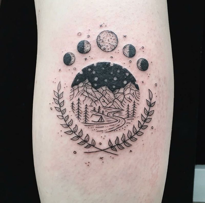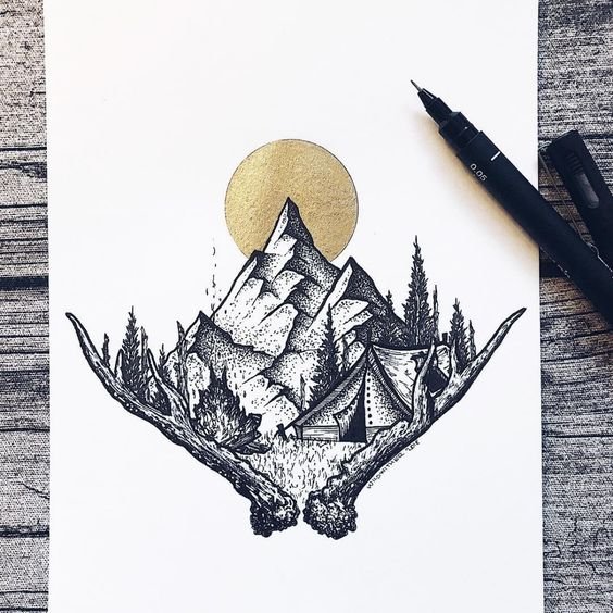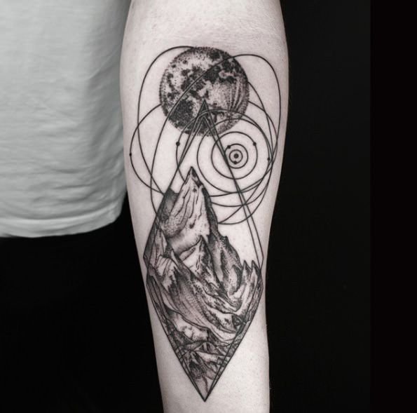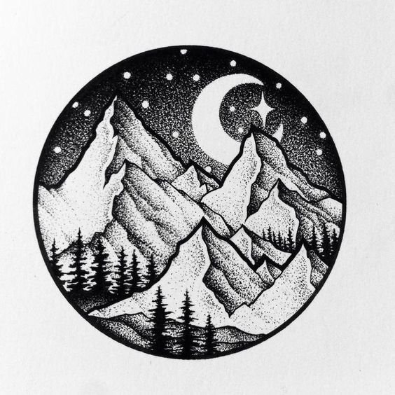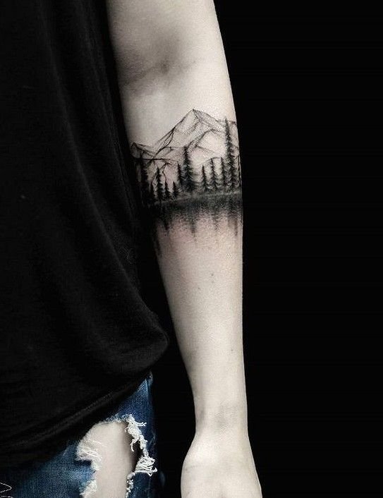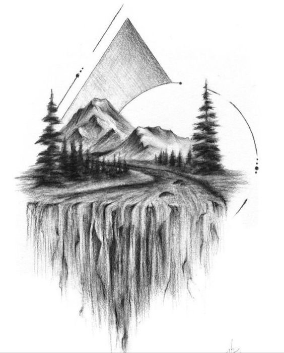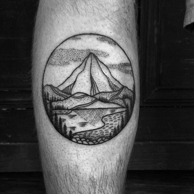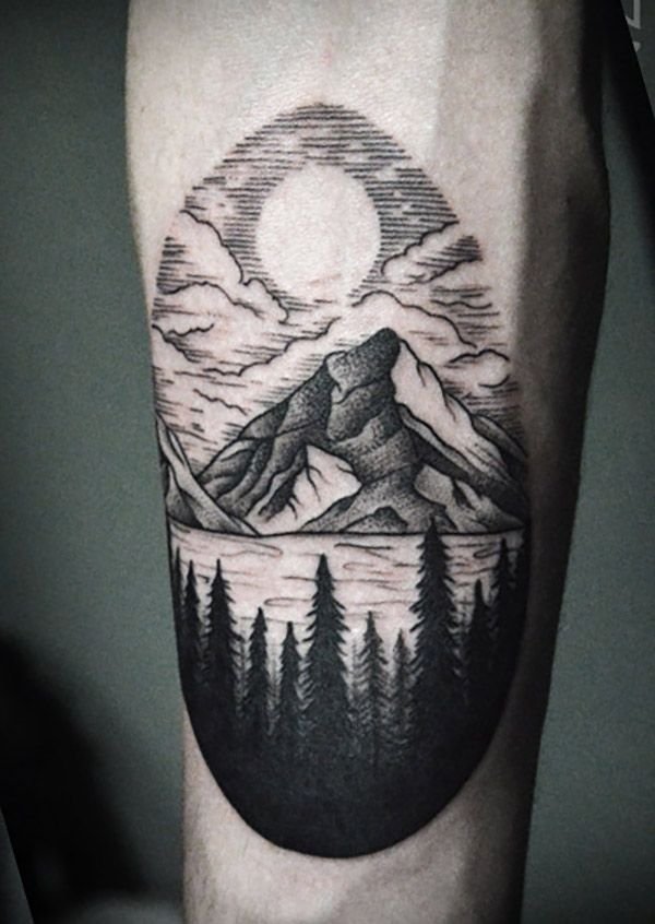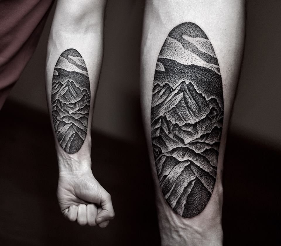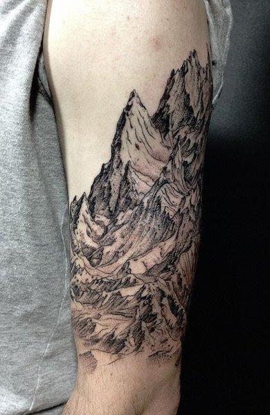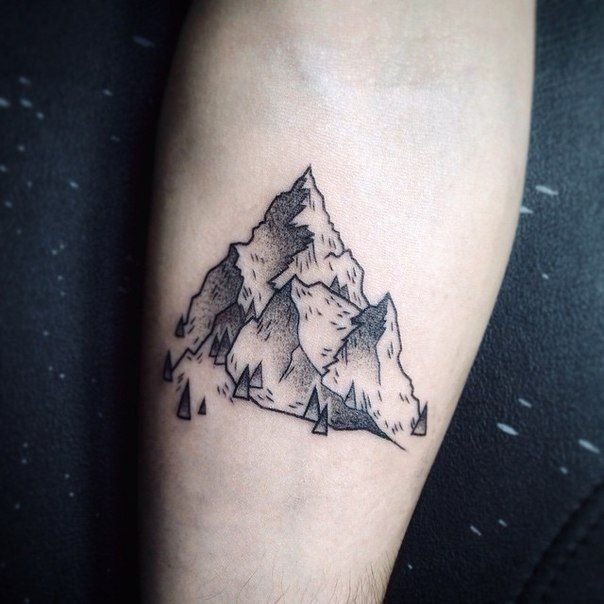 - Так трактуються пейзажні зображення гір. Але дані татуювання зустрічаються рідко, оскільки це дуже довга та трудомістка робота, не кожен клієнт та майстер в силах витримати таке навантаження. Тому для тату гір вибирають, як правило, більш спрощені варіанти зображень.