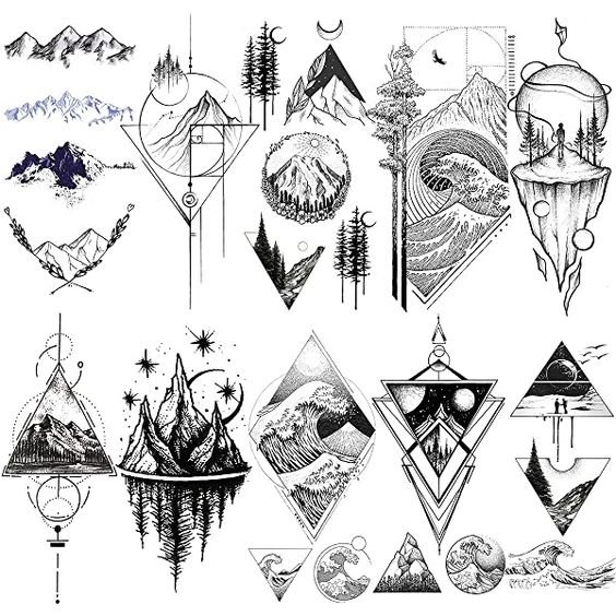 Однаково оригінально виглядатимуть гори виконані в стилі геометрії або акварелі. Зображення гір наносять як на широкі частини тіла (спина, живіт, плечі), так і на менш об'ємні, наприклад, на руки або шию. Гори на татуюванні можуть бути доповнені різними елементами. Наприклад, гори можна доповнити зображенням орла, або інших птахів або тварин. Часто зображення гір доповнюють морськими хвилями, густими деревами, або місяцем. Все залежить від польоту Вашої фантазії, Вашого бажання та вміння майстра.