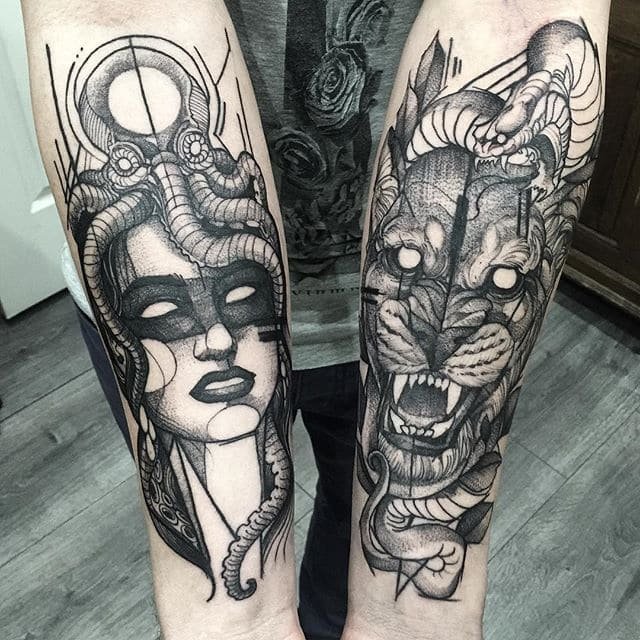 Чоловіки ж, у свою чергу, вибирають більш агресивні зображення. Наприклад, це можуть бути зображення диких тварин, таких як: вовк, ведмідь, лев й так далі. Такі татуювання підкреслюють силу свого володаря, мужність та хоробрість.