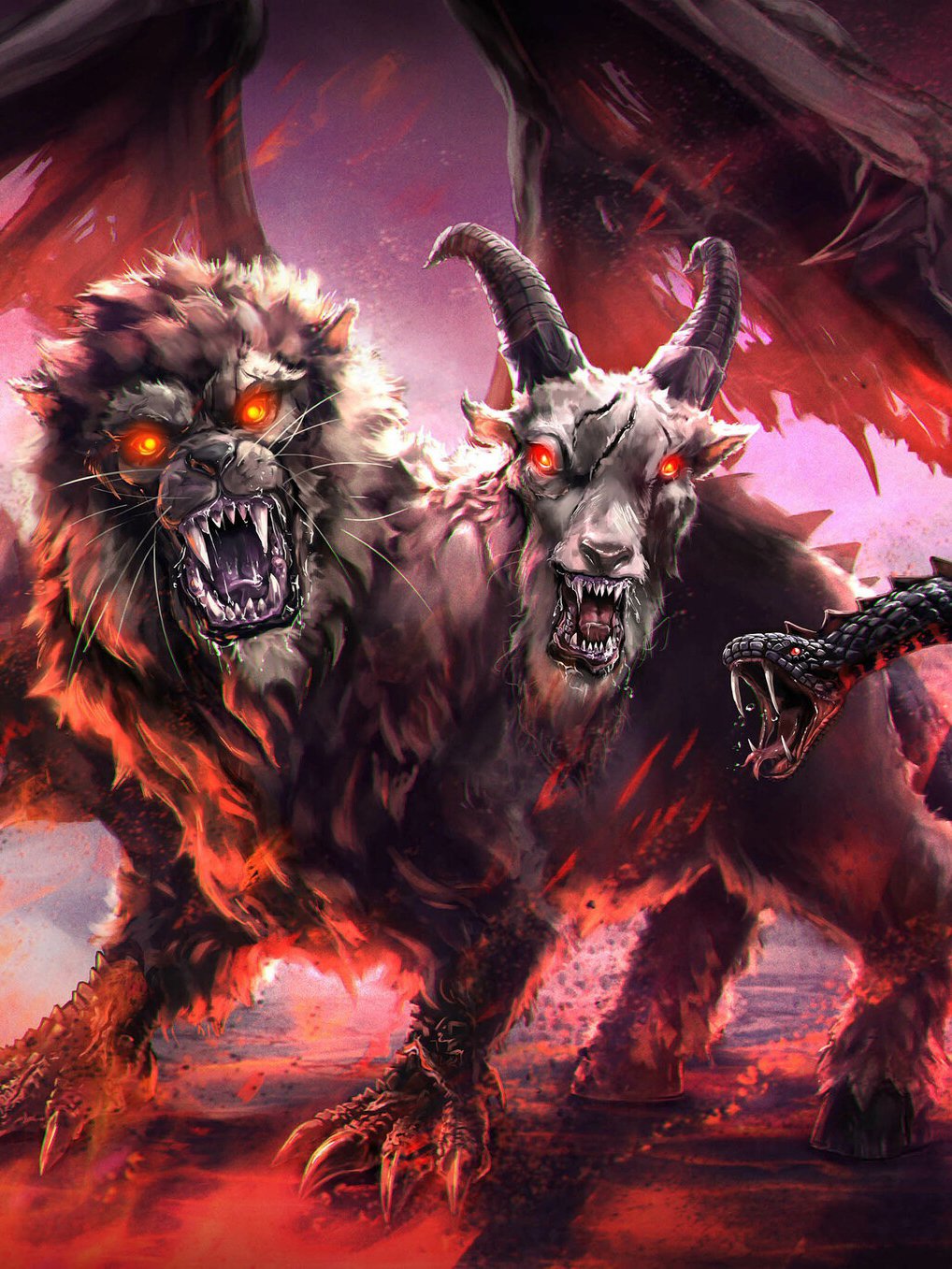 Дане виробництво має три голови: голову лева, кози й зміїну. Голова лева була спереду, на спині знаходиться козяча голова, а змія на місці хвоста. Химера наводила жах не тільки своїм виглядом, але й тим, що могла викидати вогонь з пащі. Згідно з міфологією, данну істоту міг вбити лише давньогрецький герой Беллерофонт.