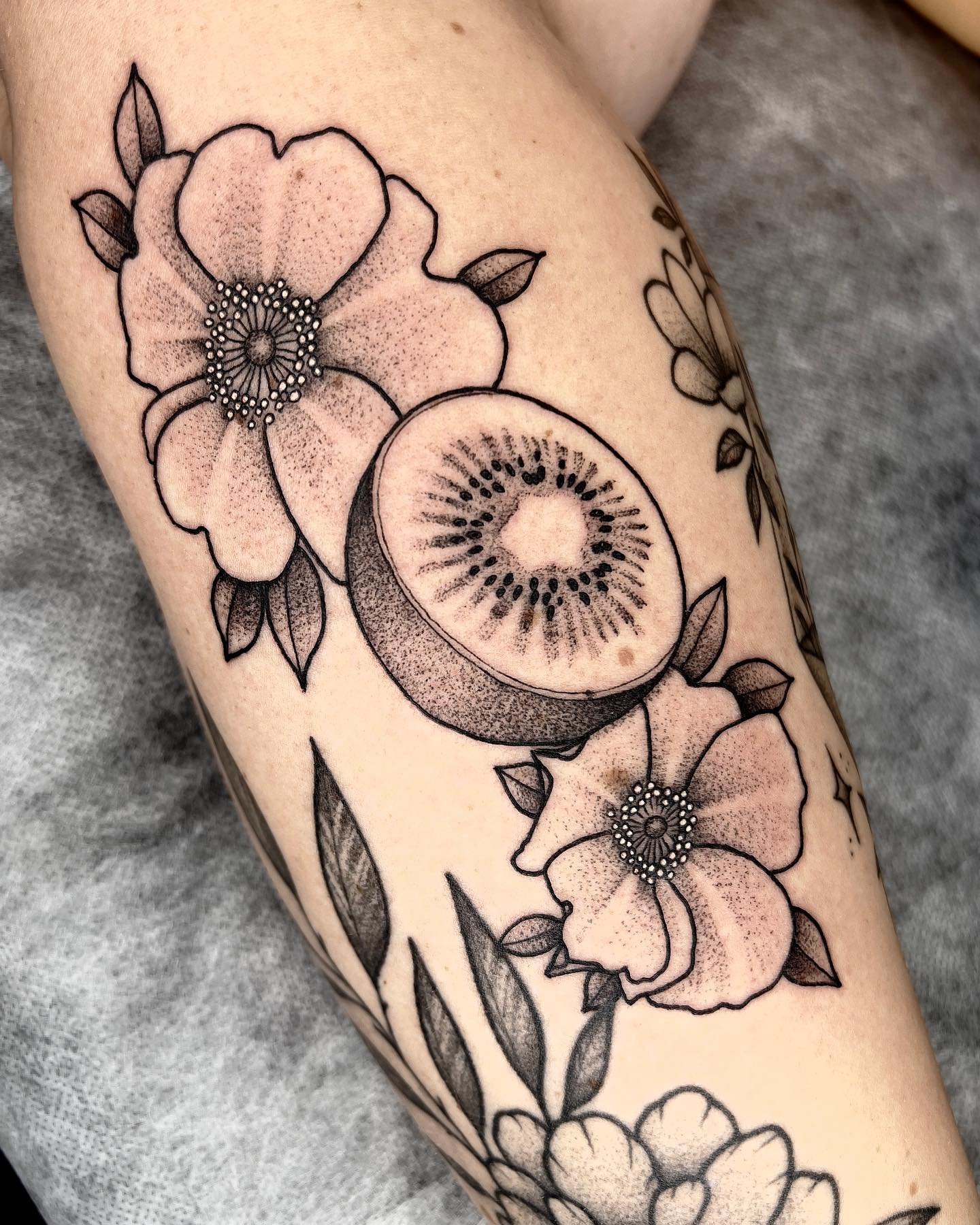 Тату ківі виграшно виглядає з іншими фруктами, птахами, метеликами, квітами і рослинними орнаментами.
