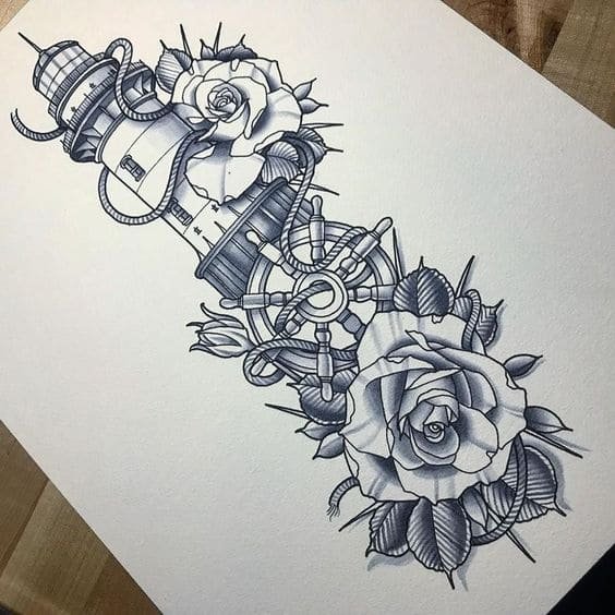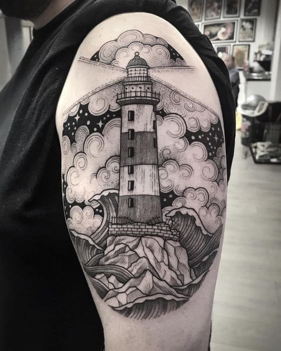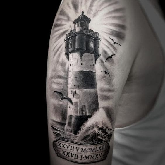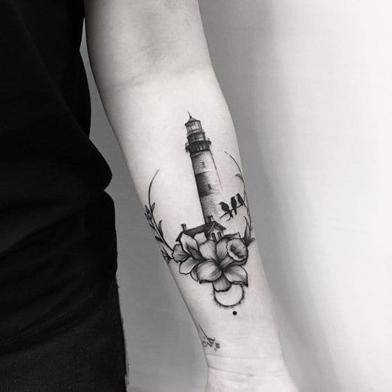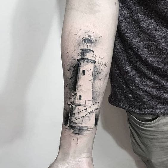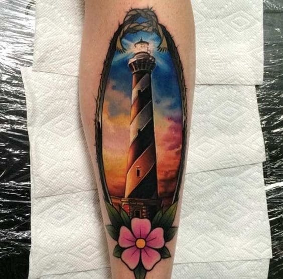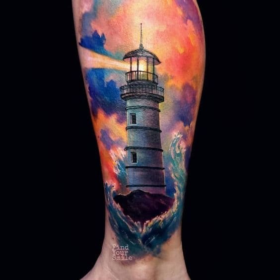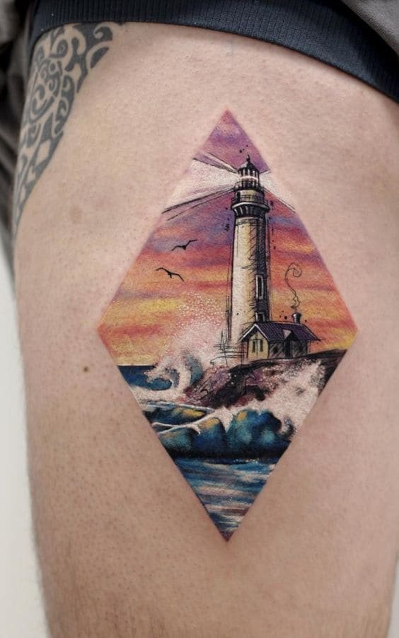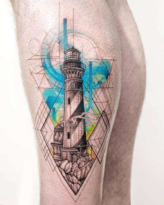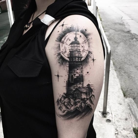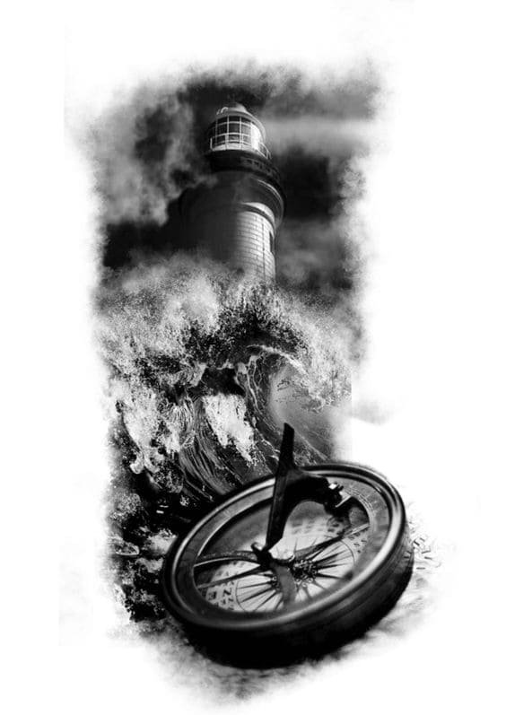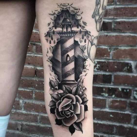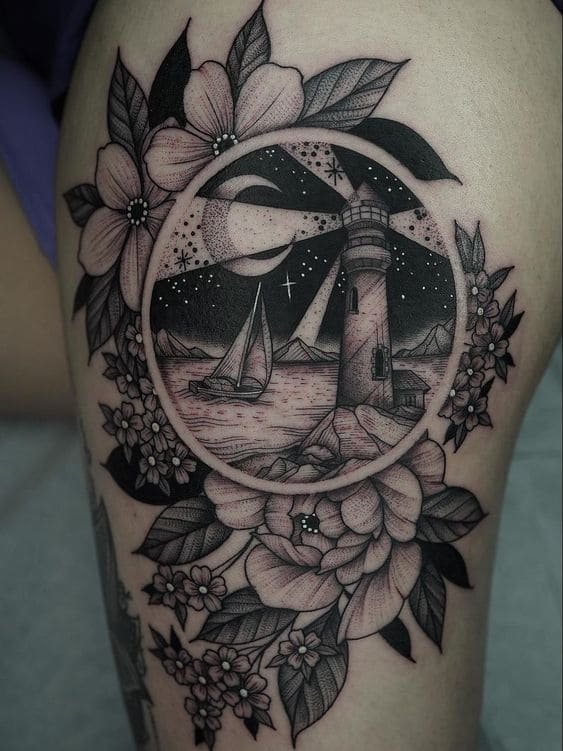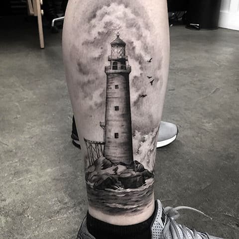 Це може бути гомілка, де роботу можна доповнити клаптиком землі поруч, морем, кораблем неподалік, скелями, рибами та іншими морськими мешканцями. На стегні місця буде дещо більше, тут можна показати картинку шторму й корабля, який шукає шлях додому. Якраз маяк на татуюванні буде вказувати на його суть: допомога в розташуванні та орієнтуванні в безкрайніх водах моря або океану.