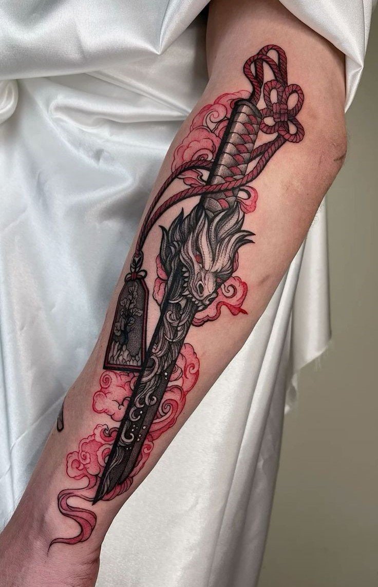 - Меч знаходиться в піхвах. Тату говорить про врівноваженість володаря тату, його розважливість та відвагу. Так само означає чоловічий, жіночий початок, по типу Інь-Ян.