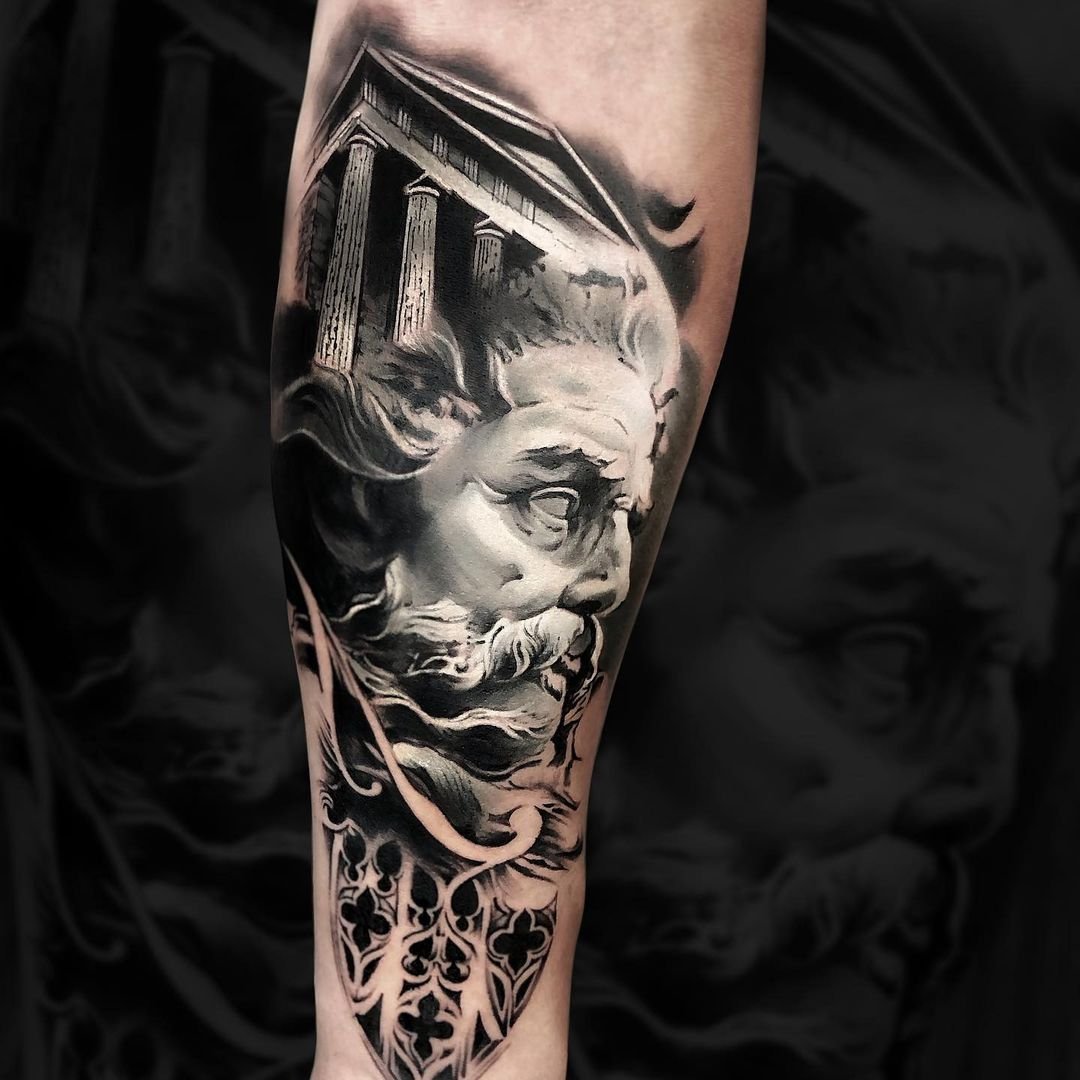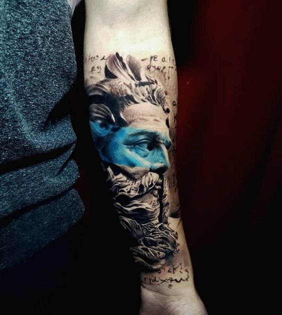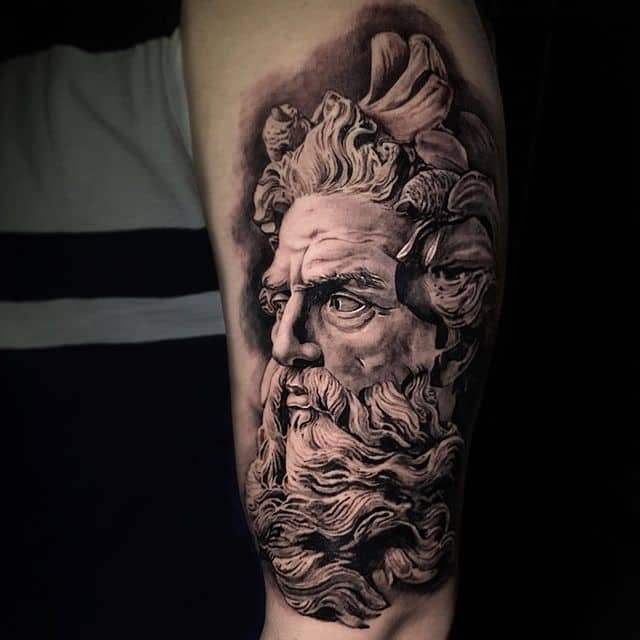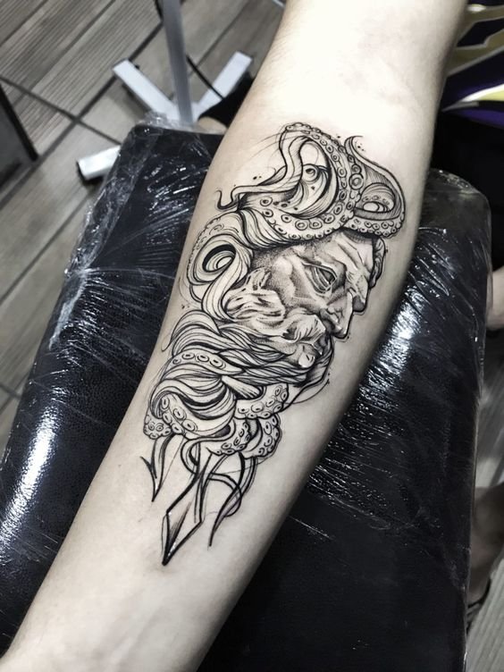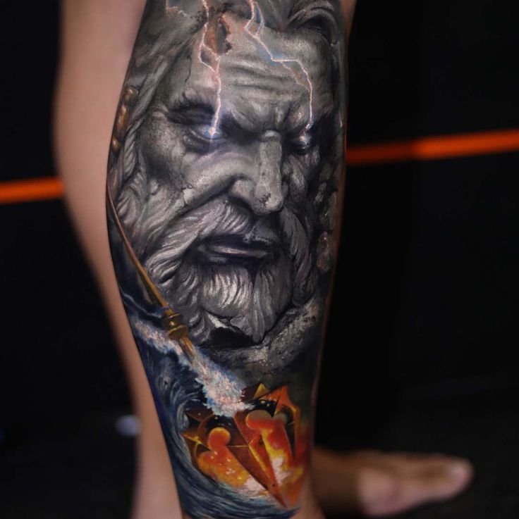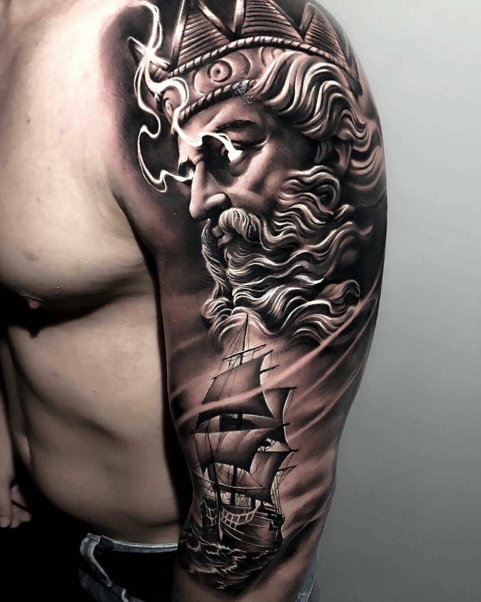 Татуювання із зображенням обличчя бога Нептуна найчастіше виконується об'ємним, з безліччю деталей.