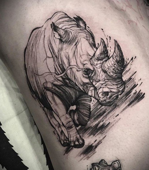 Цікавою виглядає робота, де носоріг у процесі нападу на жертву. Щоб зробити роботу ще оригінальніше, можна вибрати незвичайний стиль тату. Для цього необхідно доглянути приклад в інтернеті, а якщо такий не знайшовся - ми завжди раді допомогти в підборі кращого варіанту ескізу для Вас.