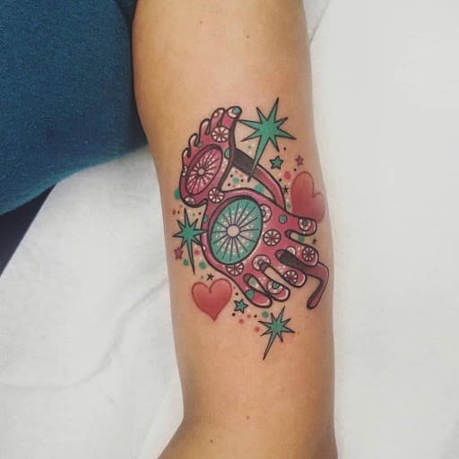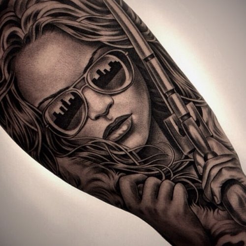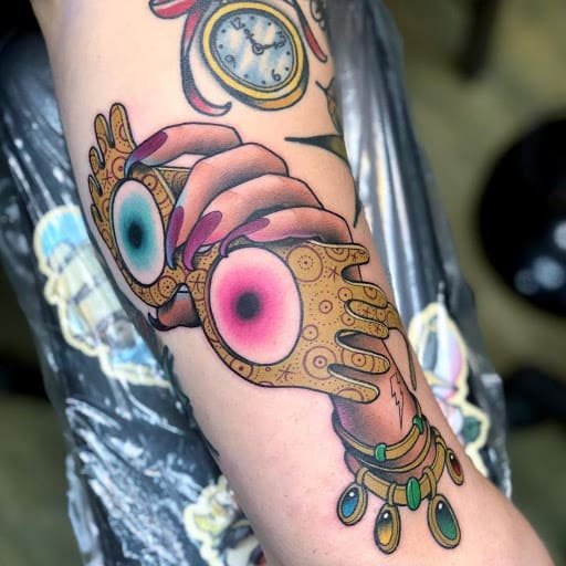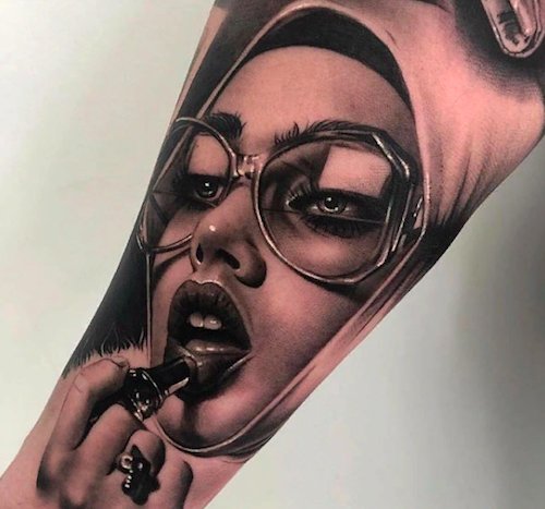 Розташувати роботу можна на кисті, де її відразу помітять навколишні люди. В якому б з перерахованих варіантів не була виконана робота, вона буде мати досить цікавий характер при виборі певного стилю тату. На зап'ясті роботу можна нанести в стилі знака нескінченності. Таким чином можна об'єднати два символи воєдино. Передпліччя помістить на собі все обличчя людини в окулярах або цілу картину, де можуть бути інші елементи на зразок книги, свічки, патефона, блокнота або чогось схожого.