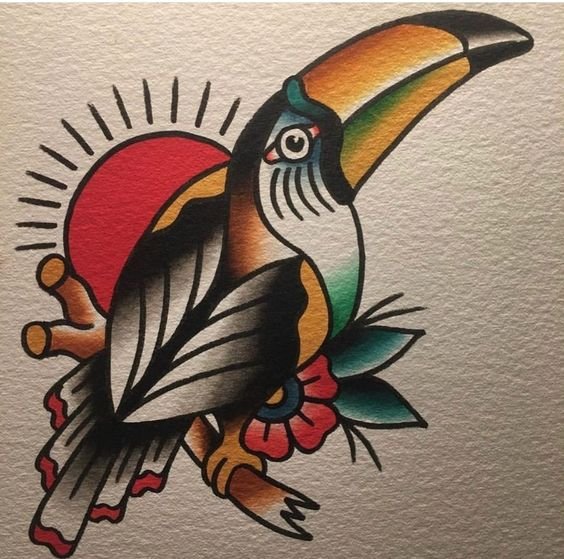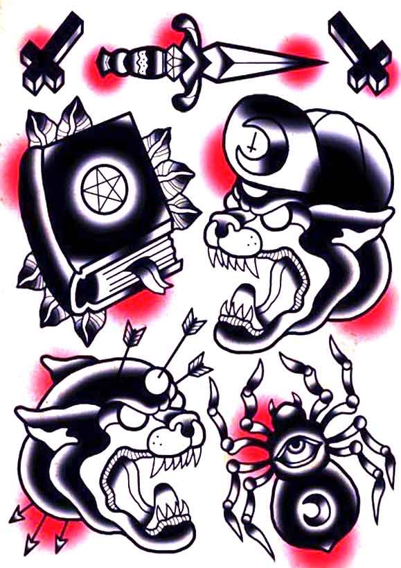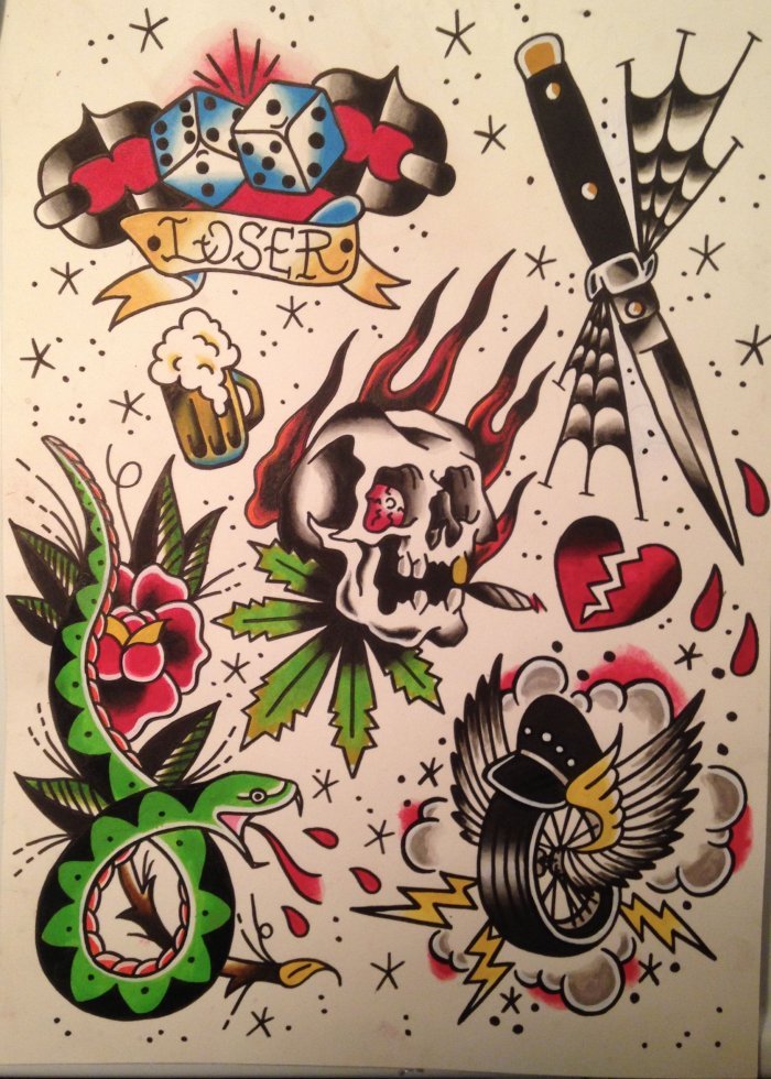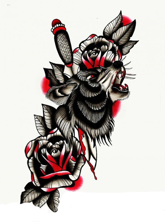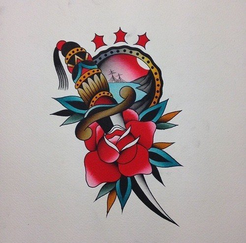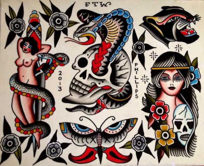 Ескізи Олд-Скул досить легко відрізнити від інших стилів тату по яскравій палітрі фарб, а також по жирному контуру чорного кольору.