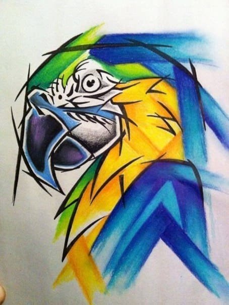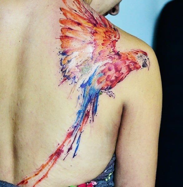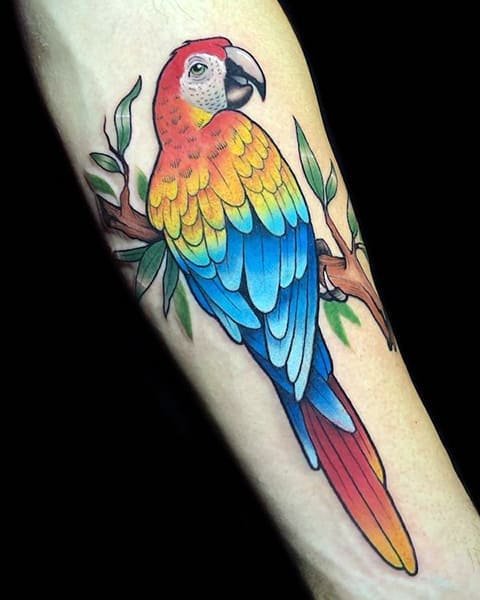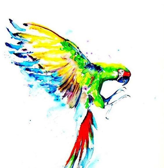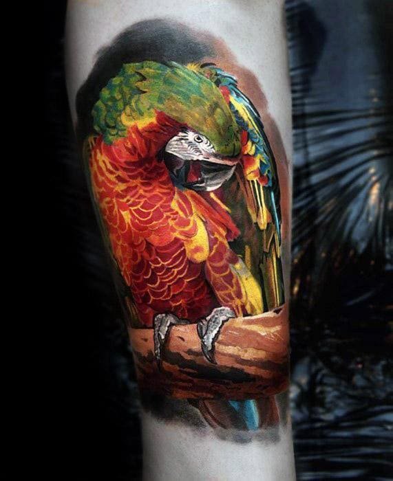 Це найпоширеніша екзотична птаха, тому дуже часто зустрічається у вигляді натільних зображень. Тату ескіз папуги виконуються в яскравих кольорах, використовуючи множину різних забарвлень.