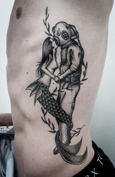 Русалка на чоловічому тілі, говорить про любов володаря тату до жіночої краси. А також, таким чином чоловіки показують що їх серце вже зайняте прекрасною дамою.