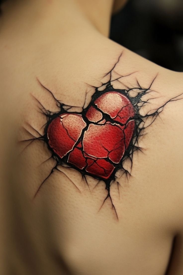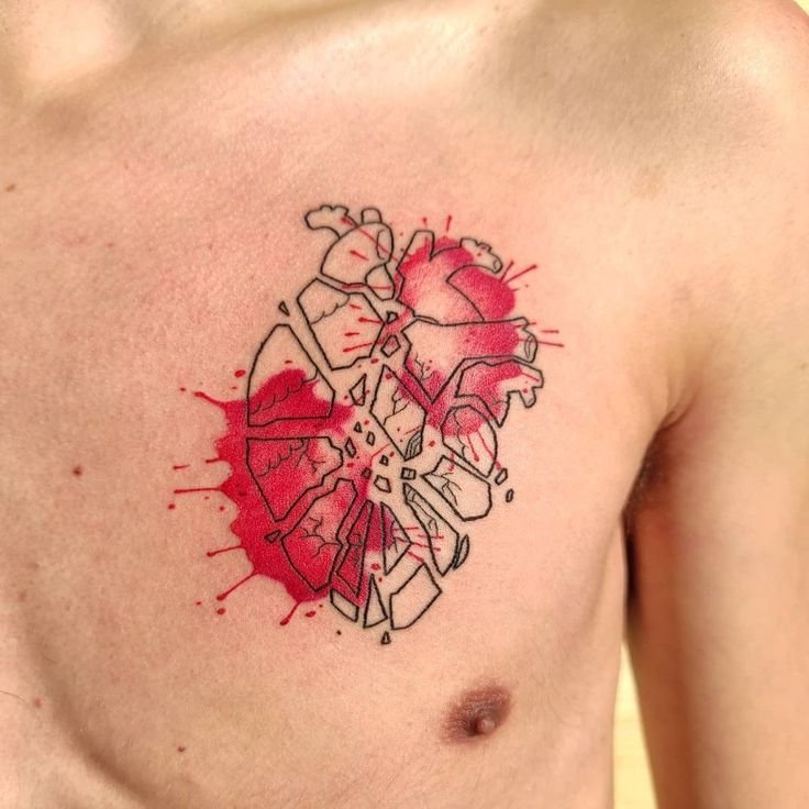 - Ескіз розбитого серця позначає загублену любов, страждання та засмучення. Так само даний натільний малюнок позначає тонку межу від любові до ненависті.