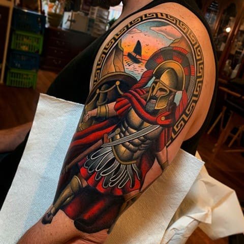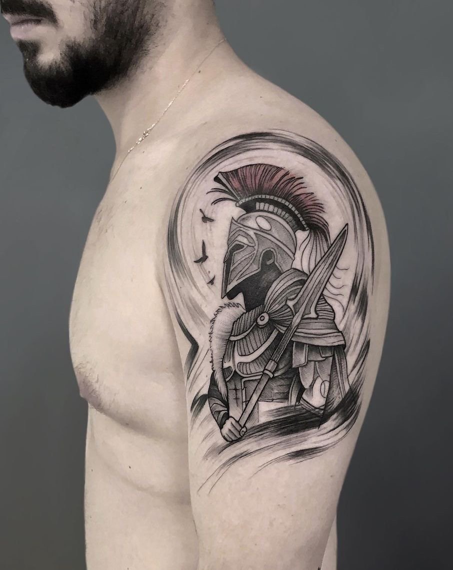 Вибираючи ескіз "спартанець" для плеча, таким чином чоловік бажає перейняти у зображення сильні якості, а так само продемонструвати навколишнім свою вдачу.