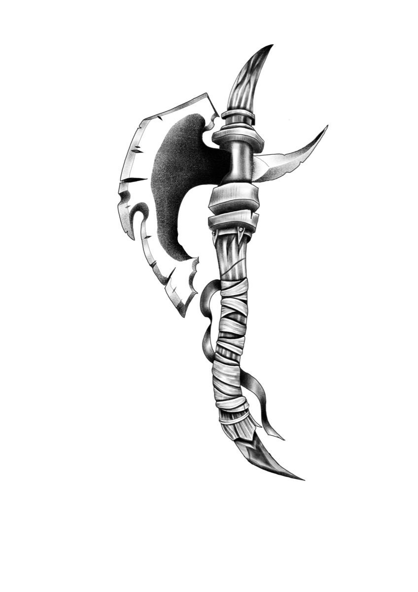 Ескіз сокири з парною кількістю лез, або тату з двома сокирами вважається потужним оберегом.