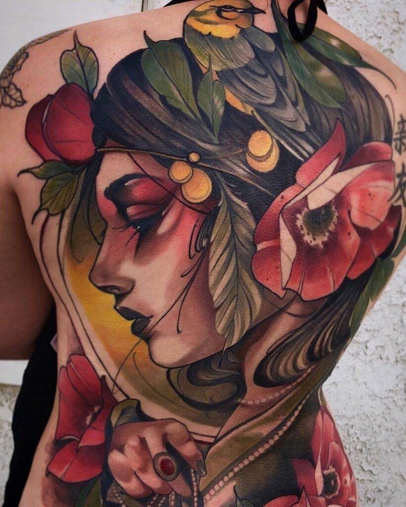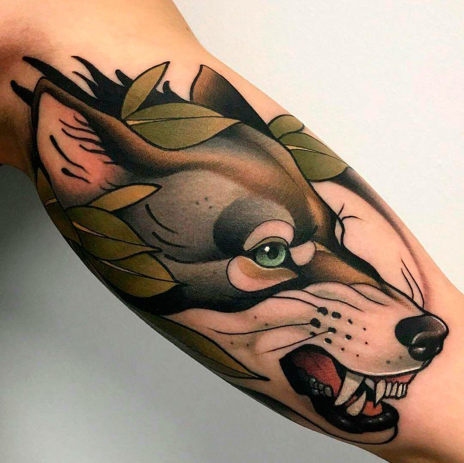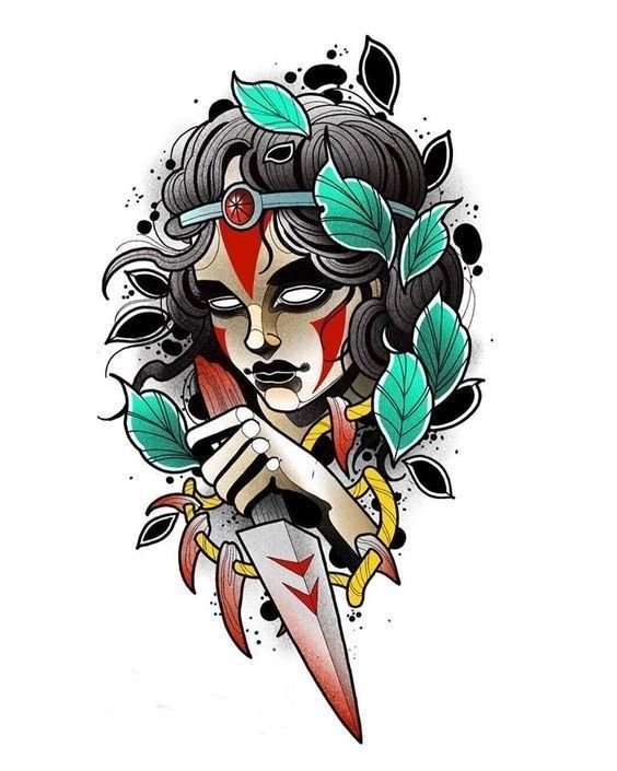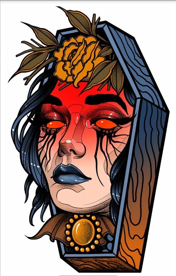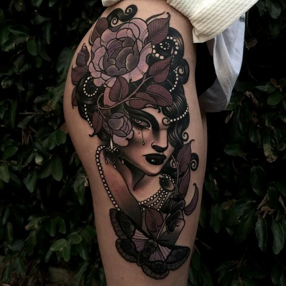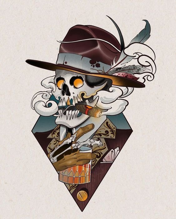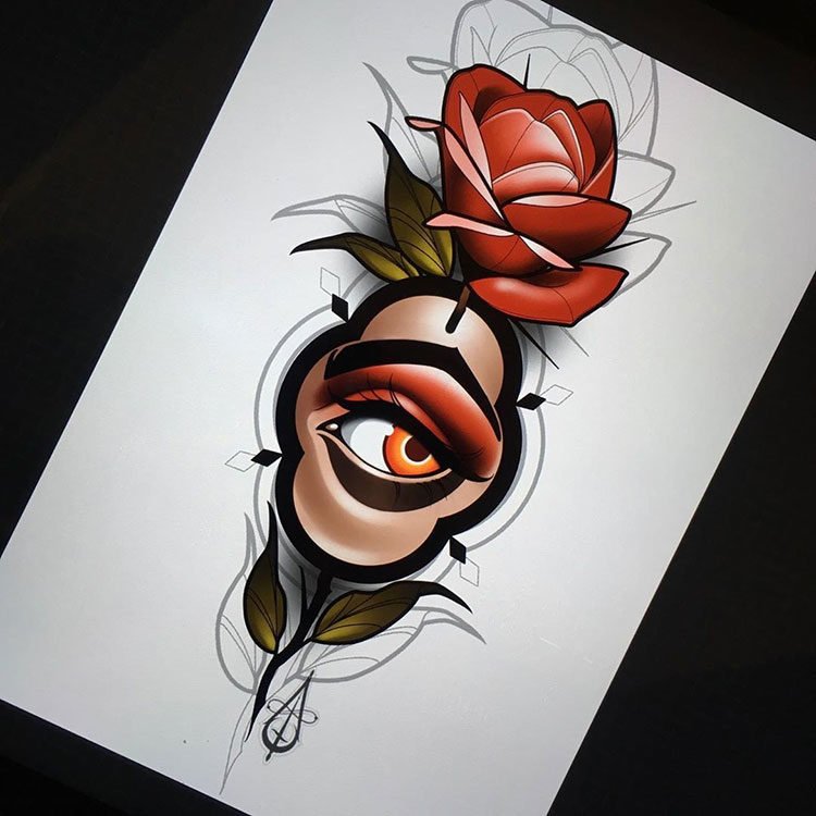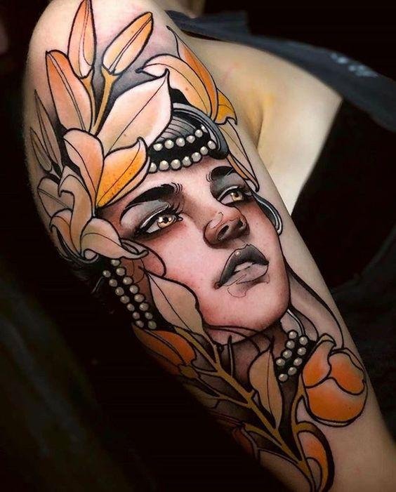 Дана техніка підійде життєрадісним людям, які дивляться на світ і навколишніх людей з оптимізмом. Зображення Традішнл середнього розміру красиво виглядає на плечі, спині або на ребрах.