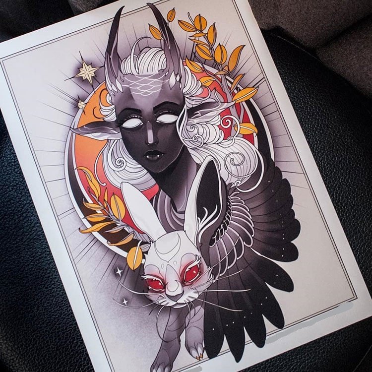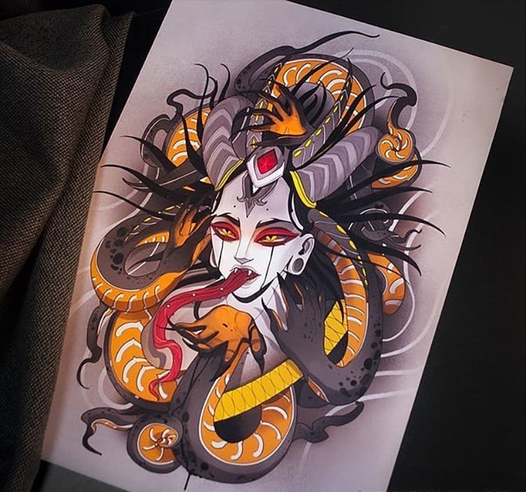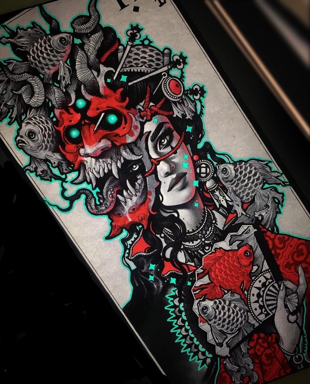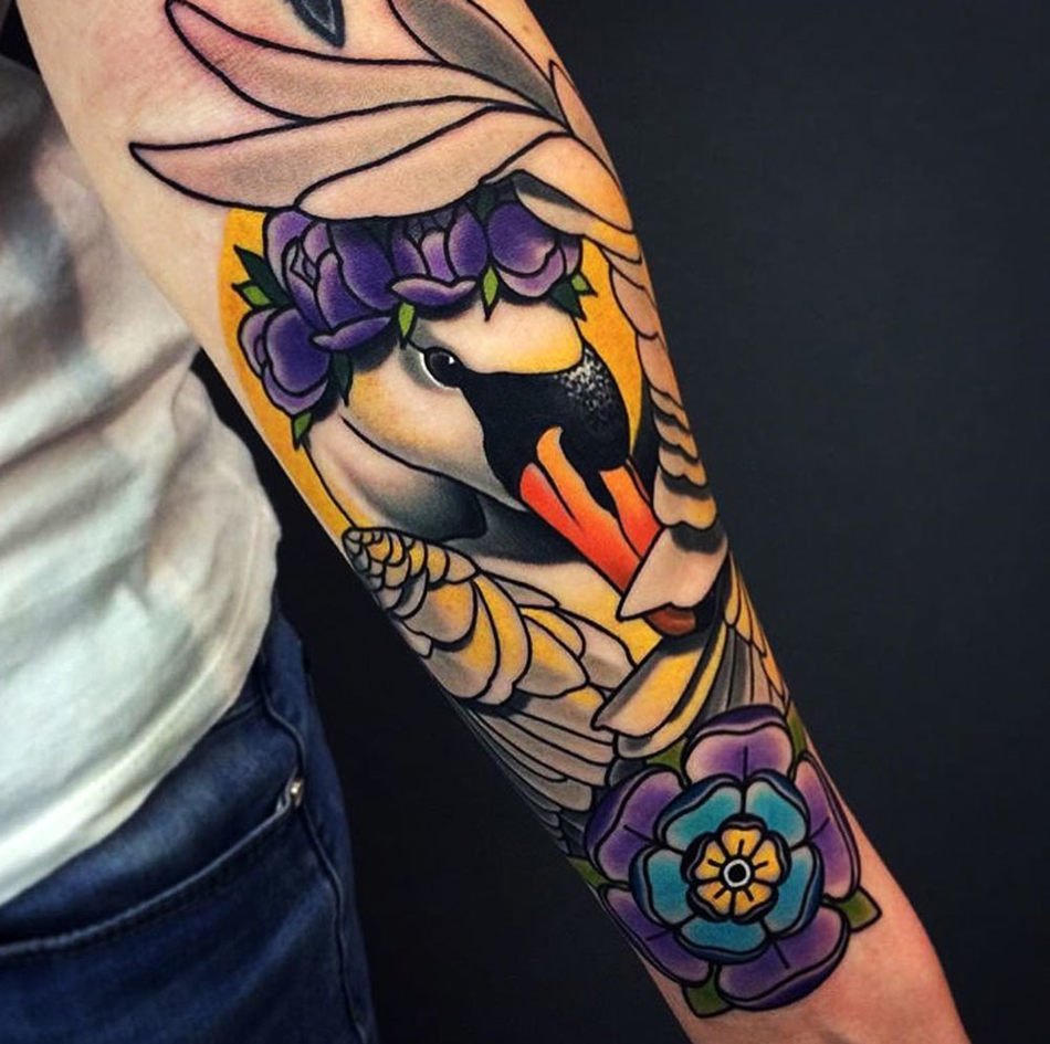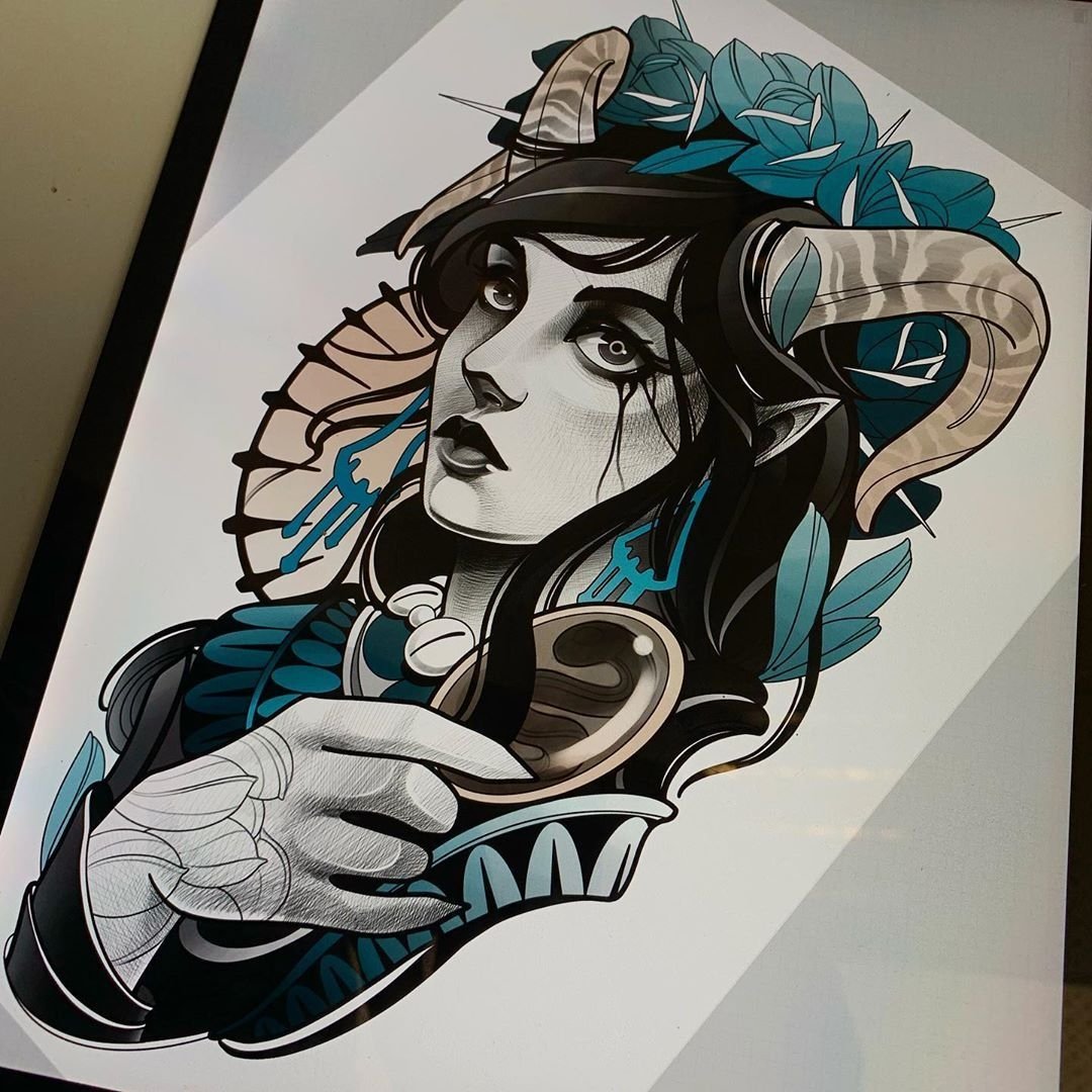 Дана техніка підійде життєрадісним людям, які дивляться на світ і навколишніх людей з оптимізмом. Зображення Традішнл середнього розміру красиво виглядає на плечі, спині або на ребрах.
