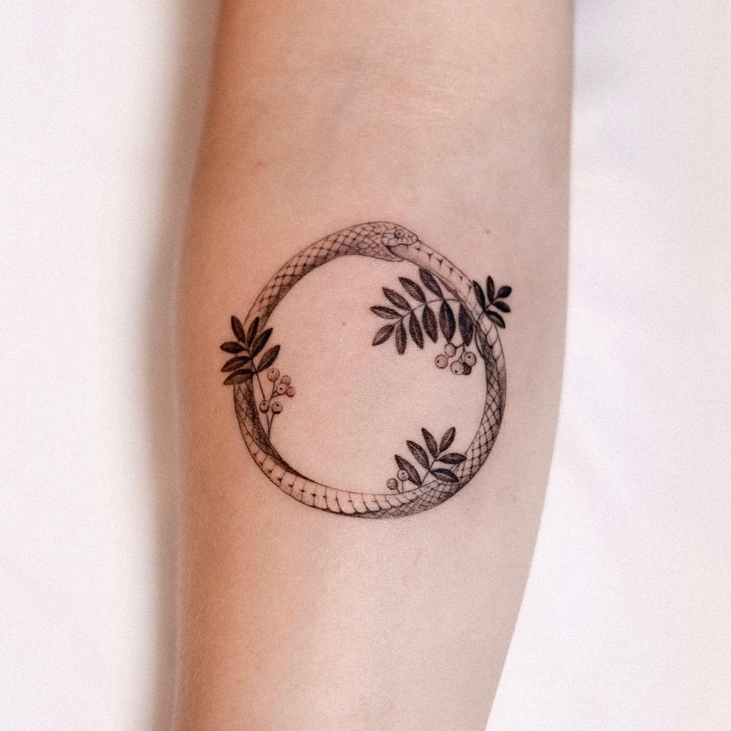 - Самодостатність: Уроборос, що кусає свій хвіст, символізує завершеність і самодостатність. Це татуювання може слугувати нагадуванням про те, що всередині нас вже є все необхідне для досягнення гармонії.