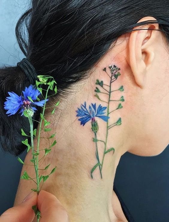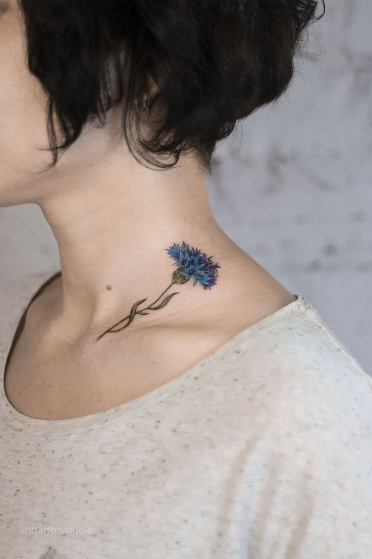 - Шия та ключиця; Якщо ви хочете, щоб ваше татуювання з волошкою привертало увагу, виберіть шию або ключицю. Ці ділянки тіла прекрасно підходять для більших і помітних татуювань. Такий дизайн можна доповнити іншими елементами, наприклад, листям або стеблами.