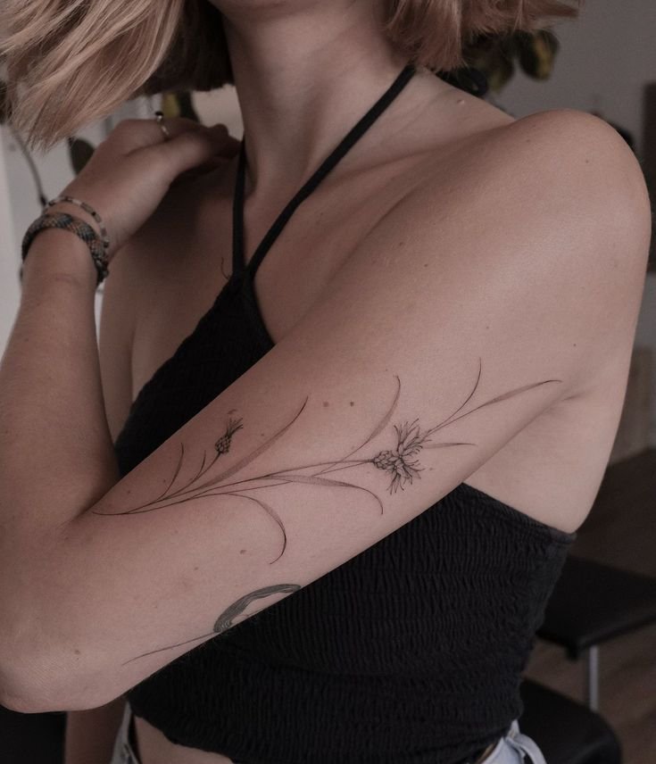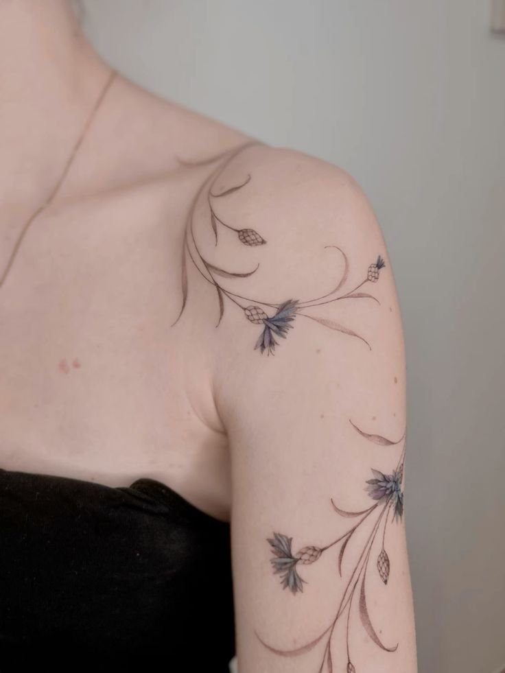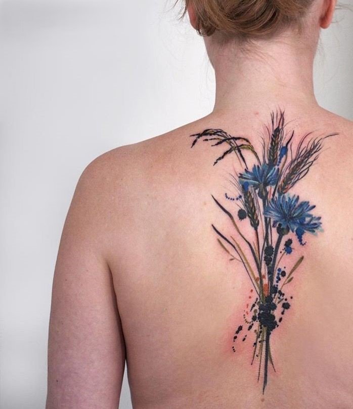 - Плече та спина: Для більш складних і деталізованих татуювань з волошкою підходять плече і спина. Ці ділянки дозволяють зробити татуювання масштабним і багатошаровим, поєднуючи квіти з іншими елементами природи або навіть з абстракцією.