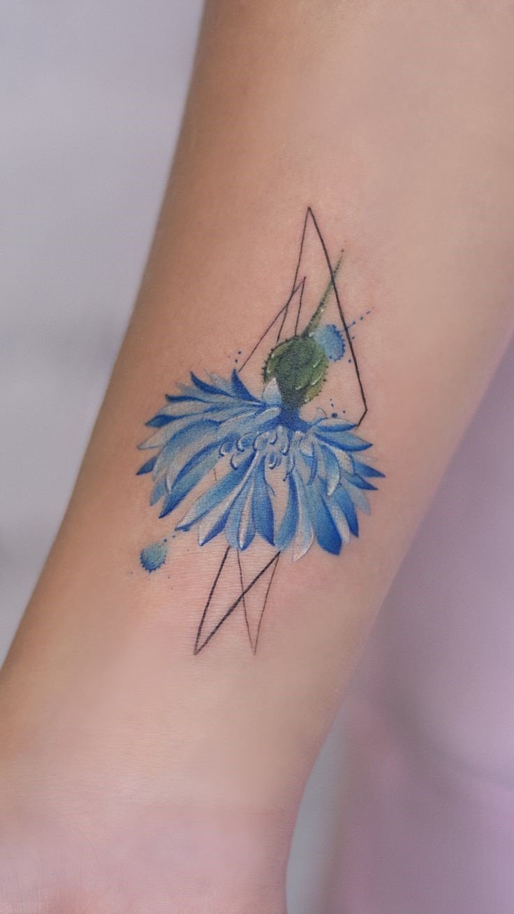 - Геометрія; Якщо ви хочете чогось незвичайного, геометричні елементи в татуюванні з волошкою створять сучасний і стильний образ. Татуювання з волошкою в геометричному стилі може поєднувати квітку з лініями, колами та іншими абстрактними фігурами, надаючи їй незвичайного вигляду.