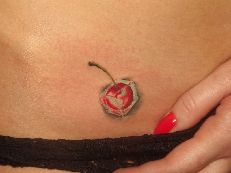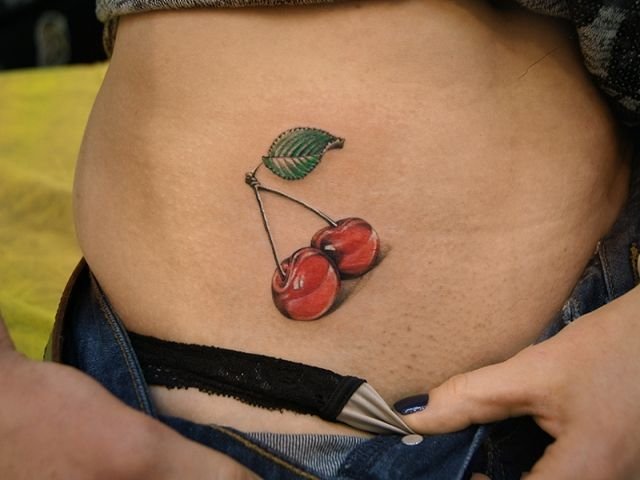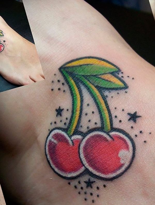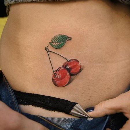 - Ягідка на торті. Часто зустрічається зображення де ягідка вишні на шматочку торта, цілому торті або на тістечку. Таке татуювання є певним талісманом, який притягує солодке життя.