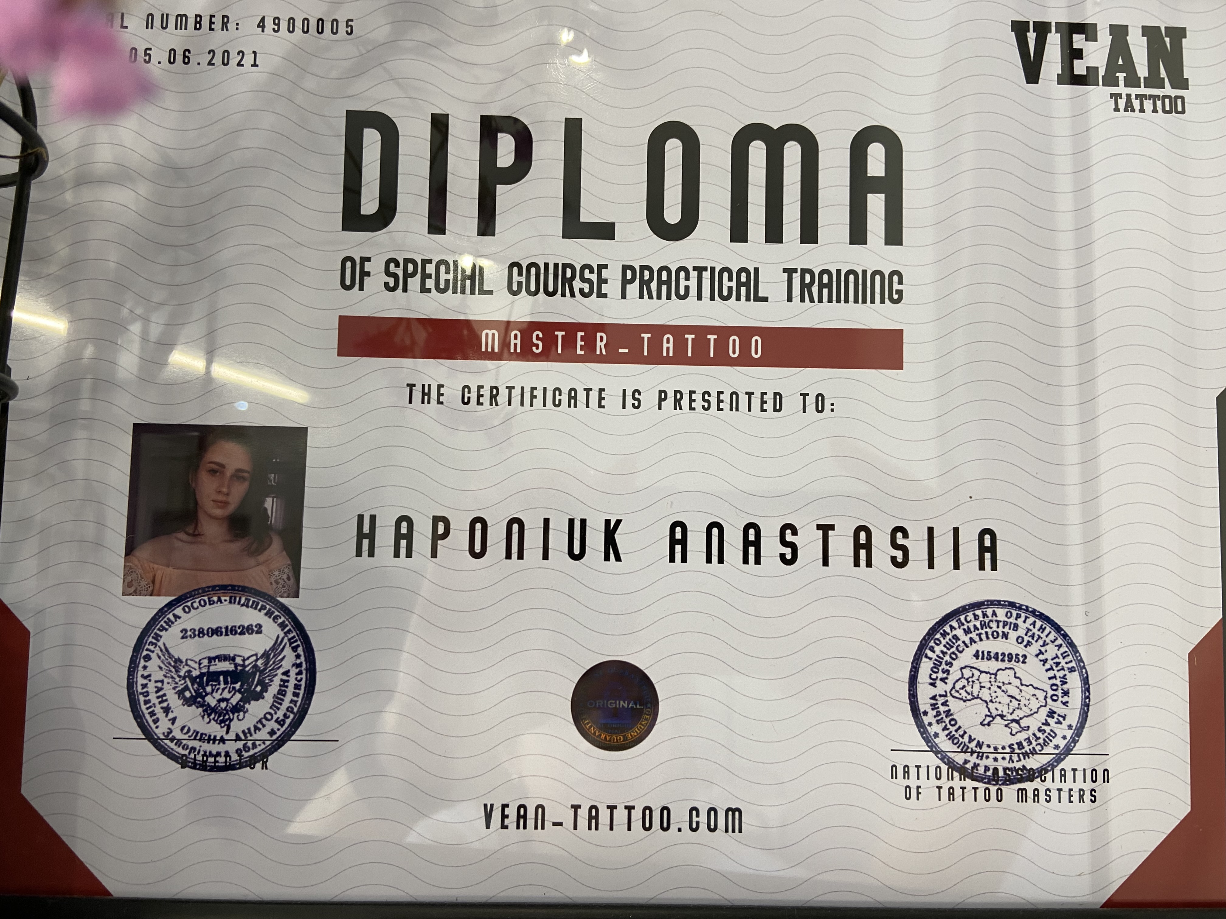 Привіт, я Настя. З дитинства дуже любила малювати і завжди знала, що хочу роботу пов'язану з цим. На початку 2021 року після завершення тату курсів майже відразу почала працювати тату-майстром. Крім малювання і тату дуже люблю книги, фільми Marvel і аніме. Працюю в графіці та кольорі, але не збираюся на цьому зупинятися, тому вивчаю нові стилі.