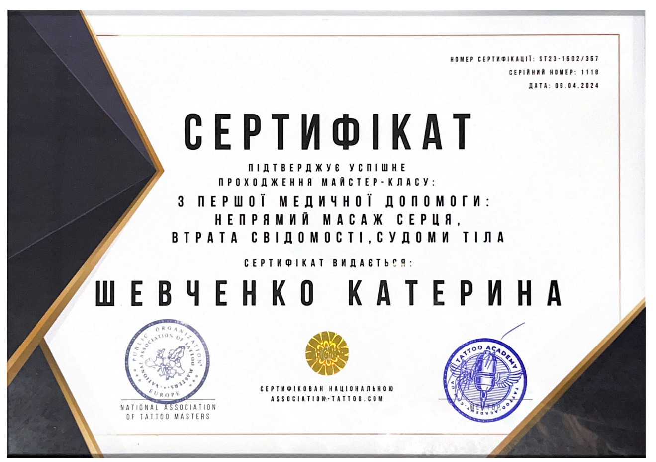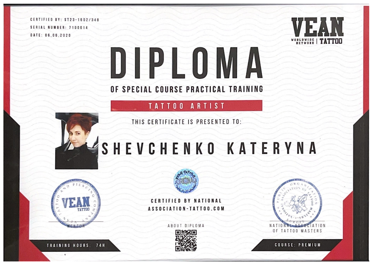 Професійний шлях почався у квітні 2020 року, коли я вперше взяла в руки тату-машинку. Проходила навчання в мережі VEAN TATTOO в місті Бердянськ, де й продовжила працювати після випуску.