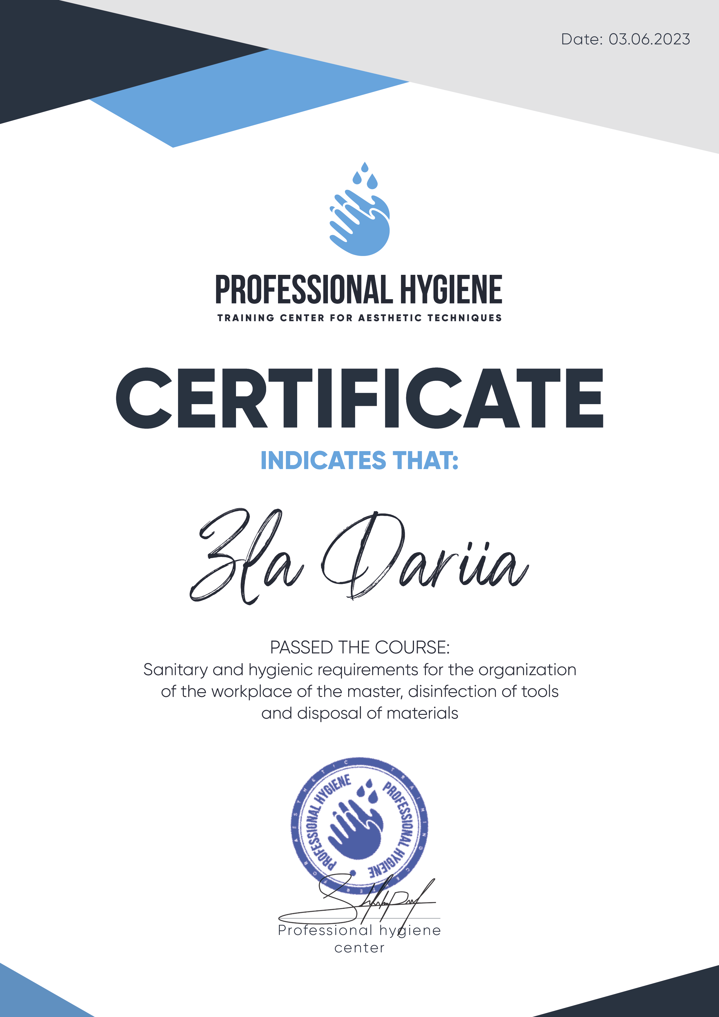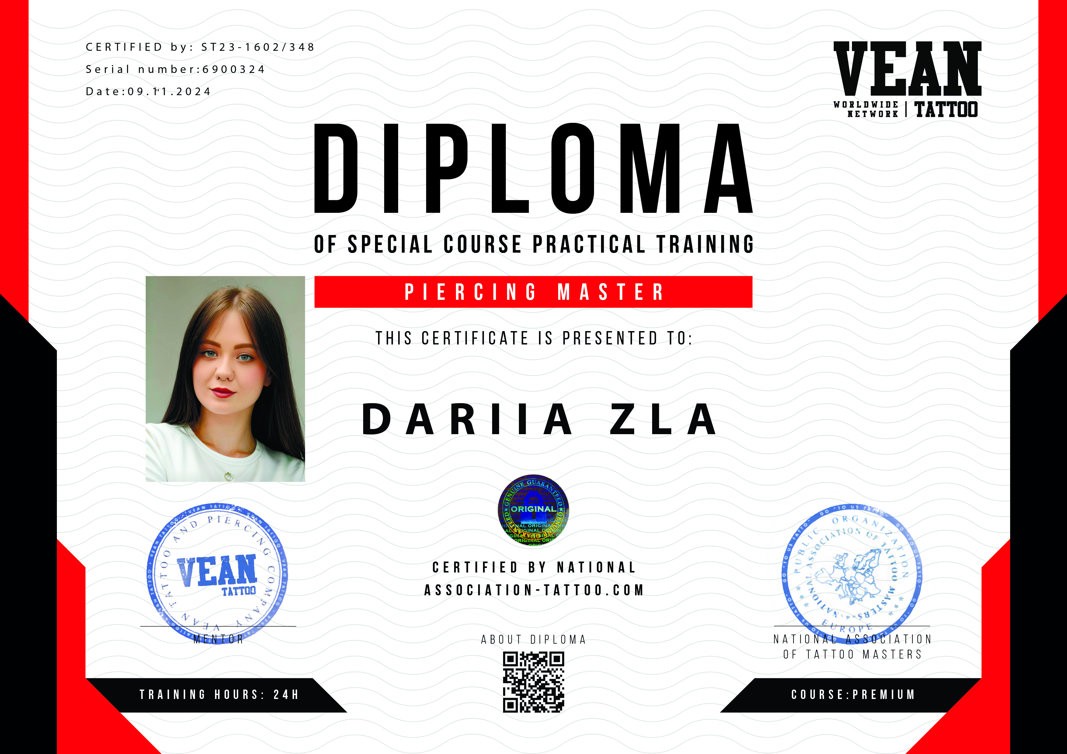 Мене звуть Дарія, я майстер пірсингу та видалення тату. Шалено люблю свою роботу, із задоволенням покращую свої навички, завжди навчаюсь чомусь новому. Моє головне завдання, як майстра, зробити свою роботу якісно, на найвищому рівні. І допомогти моїм клієнтам підкреслити свою індивідуальність пірсингом.